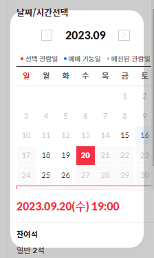 예약페이지 접속하면 위와 같이 날짜시간선택 창이 보이는데 잔여석이 나오면 해당 날짜가 파란색으로 바뀌어요. 잔여석 예매도 경쟁이 치열해서 순식간에 매진으로 바뀌니 경복궁 야간개장 예약하실 분들은 참고해 주세요.