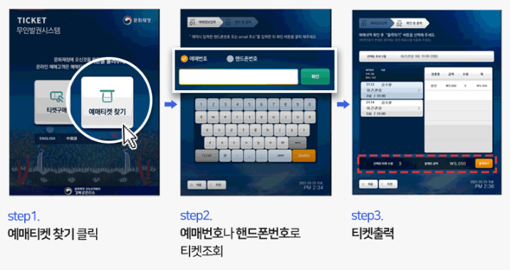인터넷 예매 후 관람 당일 광화문 들어가면 오른쪽에 무인발권기가 있습니다. 그곳에서 예매번호나 핸드폰번호를 입력한 후에 티켓출력하여 입장할 수 있습니다. 광화문 매표소에서 티켓 발권 가능 (*민속박물관 매표소, 영추문 매표소, 신문문 매표소에서 발권 및 입장 불가)