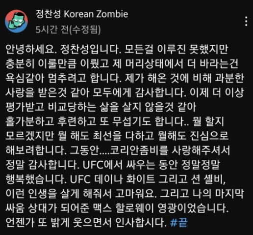 정찬성의 마지막 상대였다는 것이 영광스럽다”고 헌사했다.