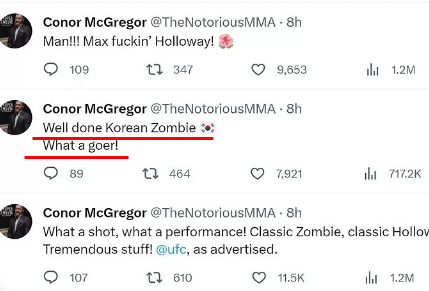 맥그리거는 UFC에서 페더급과 라이트급 두 체급을 석권한 챔피언 출신 파이터다. 그런 그에게도 코리안 좀비 정찬성이 보여준 경기는 인상 깊은 경기였던 것으로 보인다.