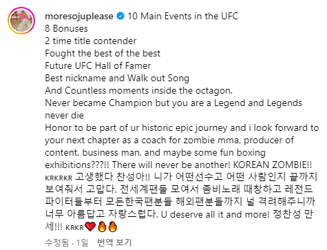 정찬성의 소속사는 박재범의 AOMG 인데요. 예전에도 박재범 정찬성 관련해서 말도 안되는 사건이 있었죠. 일단 그이야기는 넘어가고 박재범 정찬성 두 분 다 정말 멋집니다. “UFC의 10가지 주요 이벤트, 8개의 보너스, 2회 우승 후보, 최고 중의 최고와 싸웠다. 미래 UFC 명예의 전당, 최고의 별명과 퇴장 노래 그리고 옥타곤 안의 수많은 순간. 챔피언이 된 적은 없지만, 당신은 전설이고 전설은 절대 죽지 않는다”라고 적었는데요.