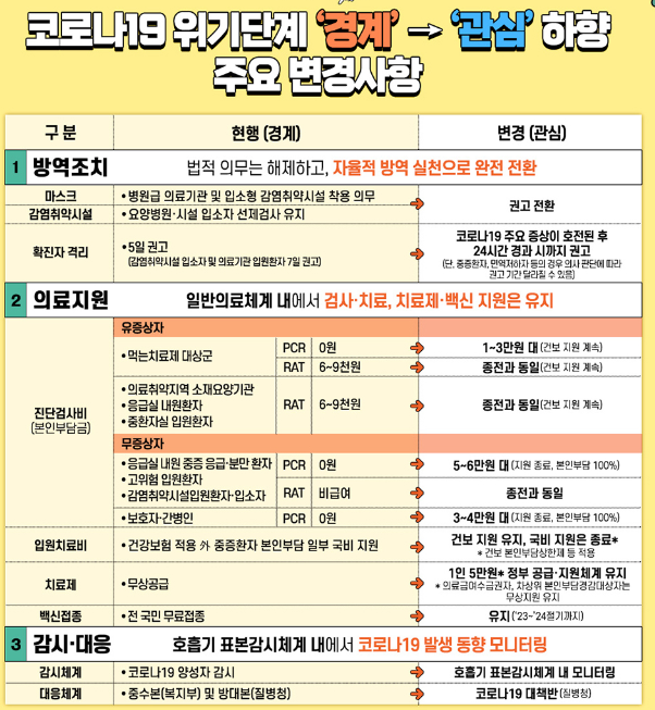 이렇게 현재 적용되고 있는 기준들은 방역과 의료 지원 모두 자율적이고 개인 책임을 강조하는 방향으로 바뀌었어요. 따라서 개인 방역을 철저히 하는 것이 매우 중요합니다. 이 정보를 잘 기억하고, 건강을 지키세요